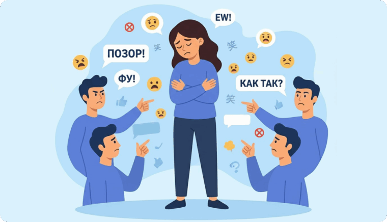 Шейминг — это стыжение и осуждение. Цель — заставить человека испытывать стыд или вину за что-то: внешний вид, мнение, поступок. Пример: «Ты слишком худая, поешь наконец» или «Мальчики не плачут».