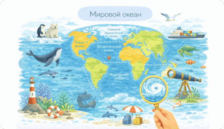 Мировой океан — это единая водная оболочка Земли, которая покрывает около 71% поверхности планеты. Он объединяет четыре крупных океана: Тихий, Атлантический, Индийский и Северный Ледовитый. Иногда выделяют и Южный океан вокруг Антарктиды.