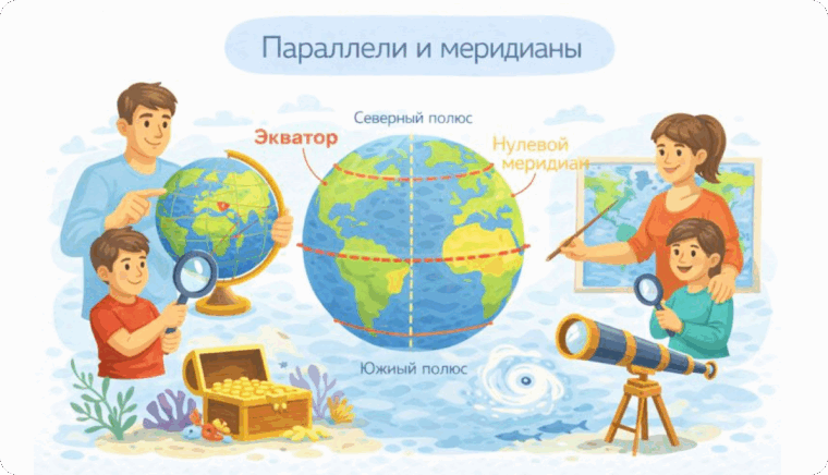 Параллели и меридианы — это основные линии на глобусе и карте, которые помогают определять положение точек на Земле.