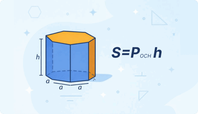 Площадь боковой поверхности прямой призмы находят по одной простой формуле. Она работает всегда, если боковые ребра перпендикулярны основанию и боковые грани являются прямоугольниками.