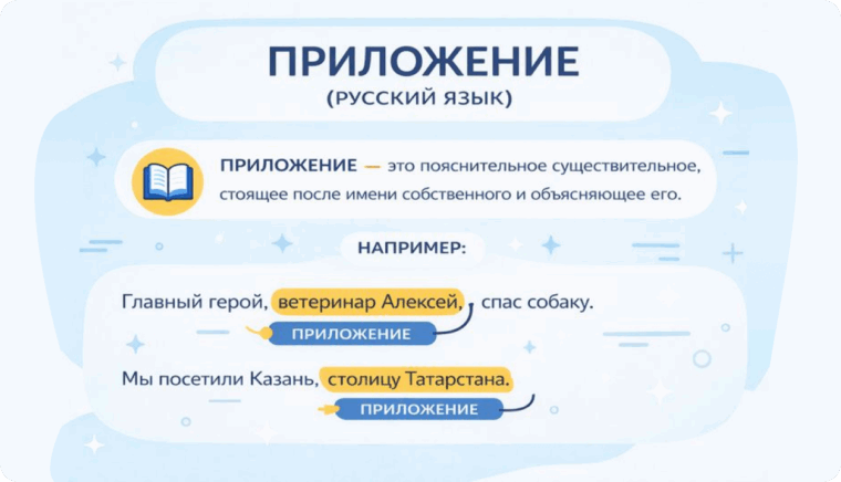 Приложение — это вид определения, выраженный существительным, которое называет предмет другим словом и уточняет или раскрывает его значение. Приложение стоит рядом с определяемым словом и отвечает на вопрос «какой?», но при этом само является существительным.