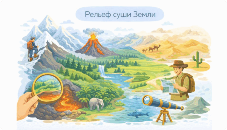Рельеф суши Земли — это совокупность различных форм земной поверхности, которые возникли под действием внутренних и внешних процессов. Он неравномерен: на планете есть высокие горные системы, обширные равнины, глубокие впадины и плато.